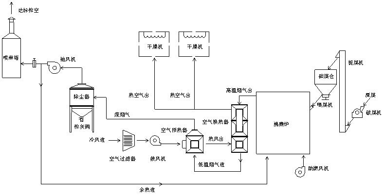 經(jīng)過(guò)項(xiàng)目小組的討論與研究,本系統(tǒng)采用了沸騰爐、列管式換熱器、多管+水膜除塵等工藝組成,沸騰爐采用流化床燃燒技術(shù),燃料適應(yīng)性廣,能燃用熱值低于3000kcal/kg的各種煤,且供熱溫度溫度可調(diào),調(diào)溫迅速,燃燼率高達(dá)99%;列管式換熱器高溫段采用耐熱不銹鋼材質(zhì),并設(shè)計(jì)獨(dú)特的梅花狀噴流管結(jié)構(gòu),能有效提升換熱效率,合理的管束排列,能控制煙氣流速穩(wěn)定在10m/s,可避免管子積灰;除塵系統(tǒng)為干法+濕法方案,即廢煙氣先經(jīng)過(guò)多管多除塵器,該除塵器由多個(gè)陶瓷旋風(fēng)子組成,除塵效率可達(dá)95%以上,風(fēng)阻小于900Pa,運(yùn)行成本低;再進(jìn)入水膜除塵塔,可對(duì)廢氣進(jìn)一步凈化,加入脫硫劑,可對(duì)煙氣進(jìn)行脫硫。